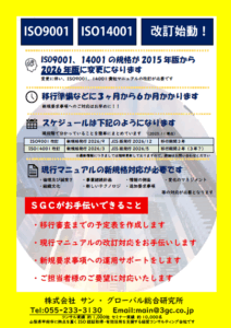 2026年、ISO9001・ISO14001が改訂されます。移行準備には3〜6か月程度を要するため、企業ご担当者様には新規要求事項への対応準備を早めに進めていただくことが重要です。 サン・グローバル総合研究所では、現在必要な準備について、コンサル会社の視点からわかりやすく解説する説明会を開催いたします。ぜひこの機会にご参加ください!